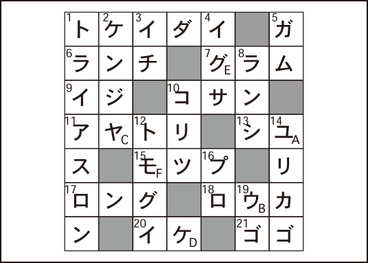 クロスワードを解き、A~Fの文字を順に並べてできる言葉を答えてください。