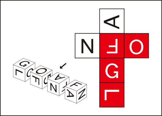 6面に6つのアルファベットを書き込んだ、まったく同じサイコロを4つ作りました。これを図のようにならべ、矢印の方向から見た時、簡単な英単語が読めます。なんと読めるのでしょう?