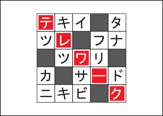カギのないクロスワードです。リストの言葉をすべて当てはめ、カナのクロスを完成させて下さい。二重ワクの文字を上から読んでできる言葉は何でしょう?