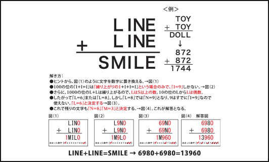 オンラインでの活動が盛んな現代にちなんだ「ふくめん算」パズルです。右の<例>のように、同じ文字には同じ数字を、違う文字には違う数字をあてはめ数式を成立させてください。 さて「SMILE」は、どんな5ケタの数になるでしょう?