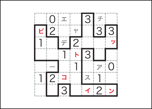 例の図のように、点線にそって―つの輪になる線を引きます。数字は、その周囲の辺に引く線の数です(0の周囲には線は引けません)。さて、一つの輪ができたら、その輪の内側にあるカナを上から順にならべてできる言葉を答えてください。
