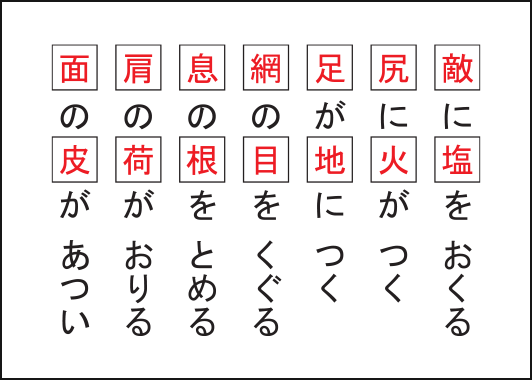 【例題】のように、下のリストにある漢字を空欄に入れて、よく聞く慣用句にしてください。すべての漢字を当てはめ、7つの慣用句をつくってください。