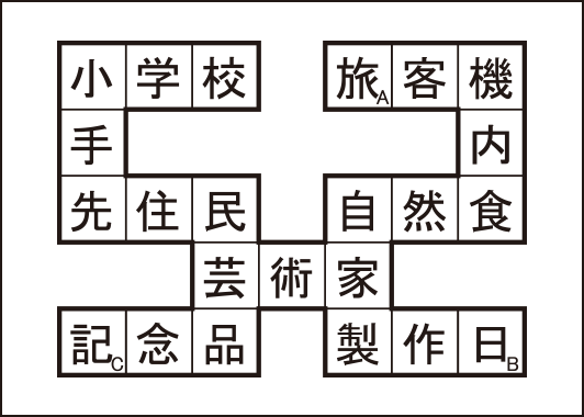 右にある11個の三字熟語を、うまくつながるように左のワクにあてはめ、漢字スケルトンを完成させてください。A~Cを並べて出来る三字熟語何でしょう?