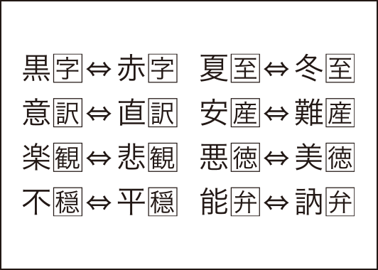⇔でつながった2語は空欄に同じ漢字が入って対義語になります。リストの漢字をうまく空欄に当てはめ、対義語を8つ作ってください。リストに余る2つの漢字でできる二字熟語は何でしょう?