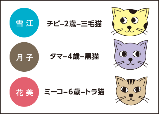 名前がチビ、ミーコ、タマで、年齢は2歳、4歳、6歳、種類は黒猫、トラ猫、三毛猫です。