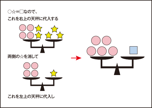 丸形、四角形、星形のおもりを、天びんばかりに乗せました。上の2つの天びんの釣り合いから、四角形1つは丸形いくつと釣り合うか、考えてください。