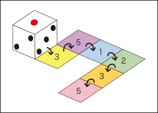 図のように、1を上にしてサイコロを置き、これを90度ずつ倒しながら移動させます。さて、この図の通りに移動すると、最後の位置の時には1~6のどの目が上になっているでしょう?