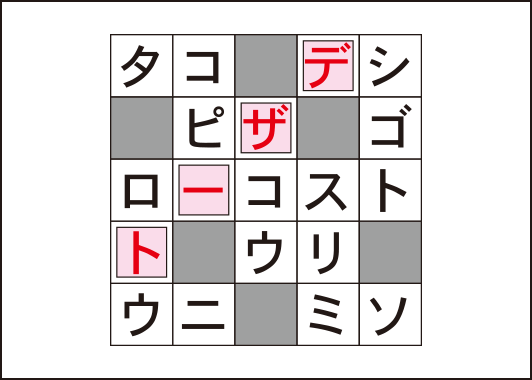 カギのないクロスワードです。リストの言葉をすべて当てはめ、カナのクロスを完成させてください。二重ワクの文字を上から読んでできる言葉は何でしょう?
