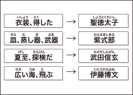 (例)のように、左の言葉を、うまく並べ替えると、有名な歴史上の人物の名前になります。4つすべてを歴史人物の名前にしたとき、五十音で最後になる人物は誰でしょう?その名前を答えてください。