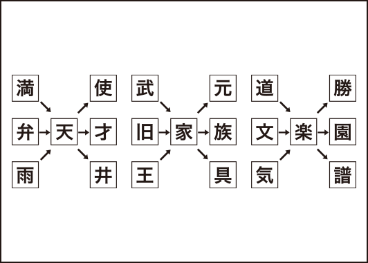 矢印の方向に読むと二字熟語ができるように、中央の空欄に漢字を当てはめてください。当てはめた3つの漢字を並べ替えてできる三字熟語はなんでしょう?