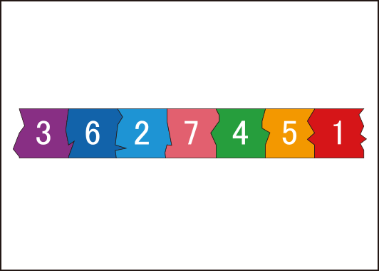 図の7つのピースを切口を合わせてうまく並べると、すきまなく横一列に連結させることができます。さて、そのように並べ替えた時、ちょうど真ん中にくるピースは、1~7のどれでしょう?