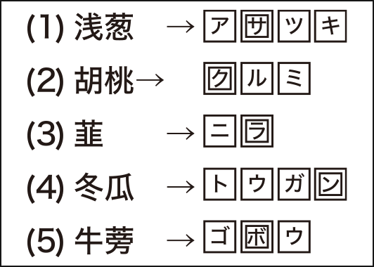 (1)~(5)の漢字の読みをカナで右の空欄に入れてください。二重枠のカナを上から読むと、どんな果物の名になるでしょう?