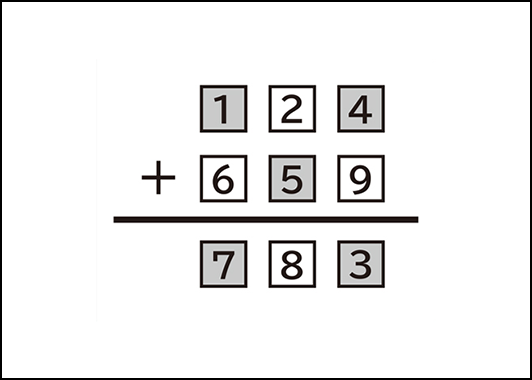 1~9までの数字を1回ずつ配置して、すでに入っている数字を手がかりに、足し算が成り立つように、数字を書き込んでください。