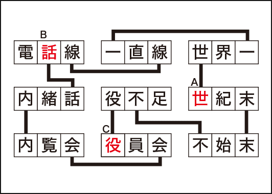 リストの漢字をすべてマスに入れ、三字熟語を9つ作ります。この時、線でつながれたマスには同じ漢字を入れてください。A~Cでできる三字熟語は何でしょう?