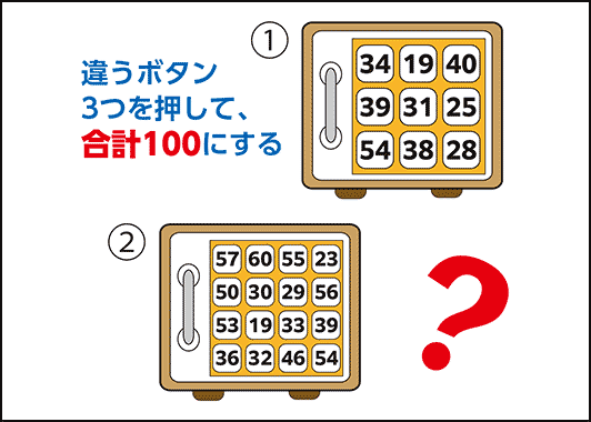 この2つの金庫は、3つの異なる数字のボタンを押して、合計が100になると開きます。数字のボタンはそれぞれ1回しか押せません。さて、どの3つの数字を押せばいいでしょう?①と②の、両方を開けてください。