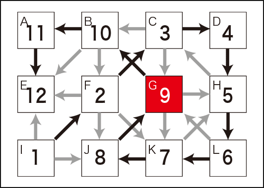 ●「I」のマスは、外に向かう矢印だけなので、ここに出発点の「1」が入ります。