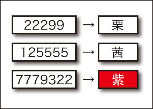7779322→マ行3番目、ラ行1番目、サ行1番目、カ行2番目→むらさき