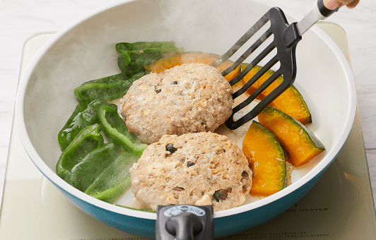 フライパンに蓋をして両面を弱火でゆっくりと焼く。ピーマン・かぼちゃも一緒に焼く。(レンジ加熱可)