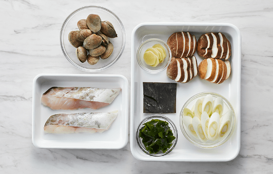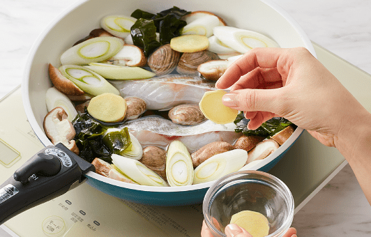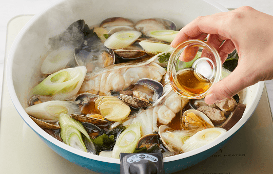 あさりの殻が開き、たらに火が通れば、ごま油を回しかけて仕上げる。
