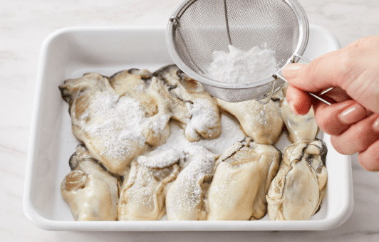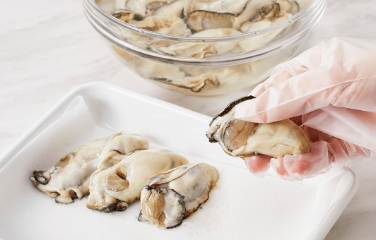 牡蠣に下処理用の塩をして軽く混ぜ、ボウルに張った水で2、3回洗って汚れを取り除き、キッチンペーパーに上げて余分な水分を取る。