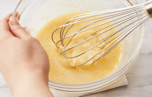 〈A〉の薄力粉と水を泡立て器で合わせ、卵を加えて泡立てるように混ぜ、玉ねぎを入れて軽く混ぜる。