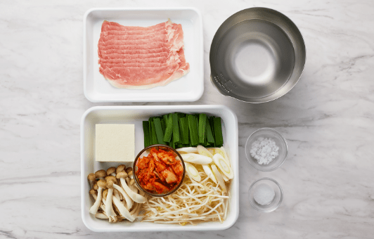 ①に水とAを入れ、沸騰させる。豆腐、白ねぎ、しめじ、もやしを入れ、ひと煮立ちしたら具材を端に寄せて、空いたところで豚肉をほぐしながら入れる。