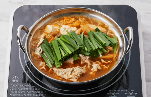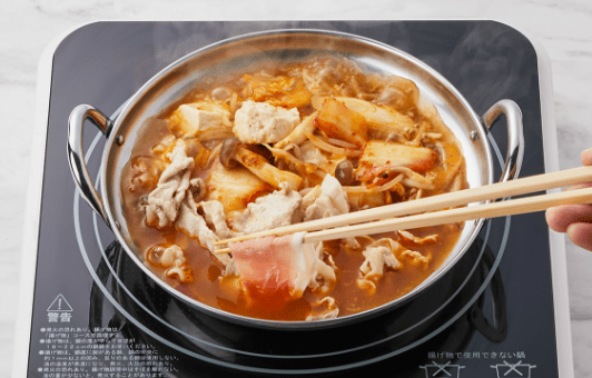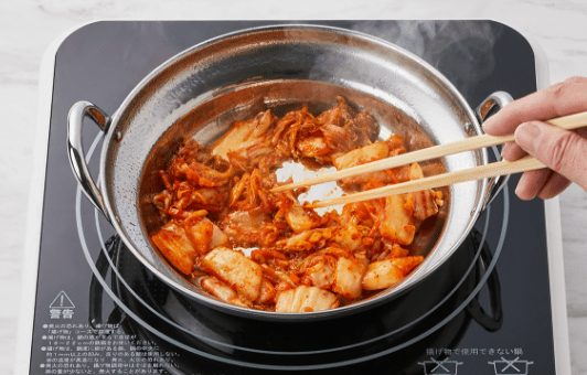 鍋を中火にかけてごま油を入れ、キムチを入れて1分ほど炒める。