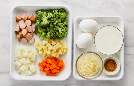 ボウルに卵を割りほぐし、Bを混ぜ合わせ、①に流し込む。