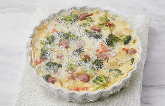 ②にふんわりラップをして、600Wで8分レンジ加熱する。