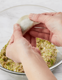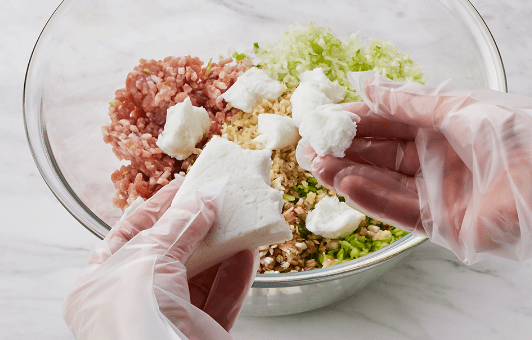 ボウルに豚ミンチ、〈A〉、はんぺんはちぎりながら加える。片栗粉、〈B〉も加え、はんぺんをつぶすように混ぜる。