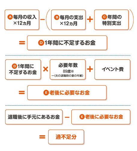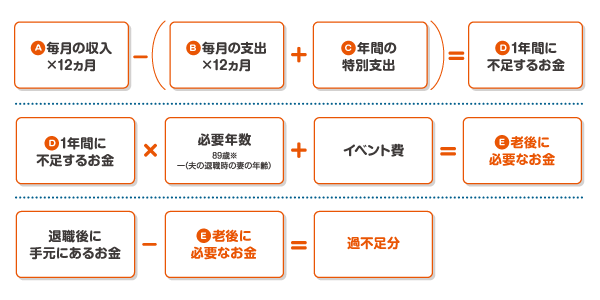 老後に不足するお金の目安は、老後の年間収入から支出を差し引いて算出した「1年間に不足するお金」×「必要年数」で概算を知ることができます。「必要年数」とは、60歳時点の女性の平均余命が29年なので、89歳-「夫が退職時の妻の年齢」で計算しましょう。
