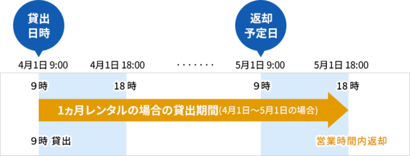 例1)4月1日から1ヵ月レンタルの場合 5月1日中(店舗返却の場合は営業時間内)に返却