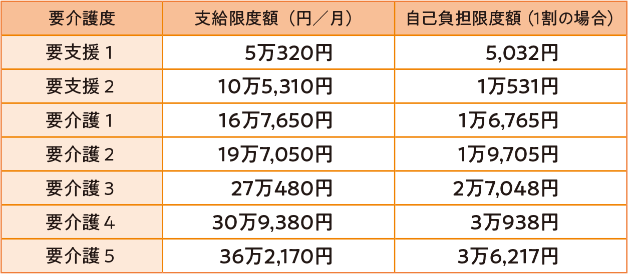 厚生労働省「サービスにかかる利用料」より「支給限度額」とは、要介護度別に利用できるサービスの上限額。収入に応じて1~3割が自己負担となる。支給限度額を超えて利用することもできるが、その分は全額自己負担になるので要注意。