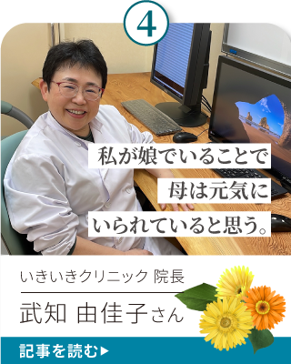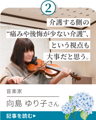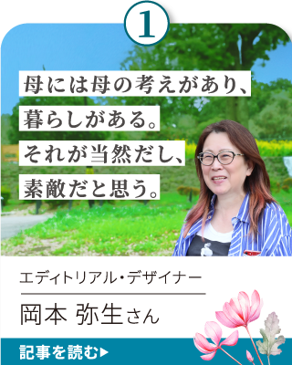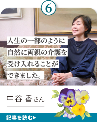 ここでは、介護経験のある方々にインタビュー。子どもの頃の家族の思い出をはじめ、介護を通して気づいたこと、考えたことなど「いま、思う」ことをさまざまに語っていただいています。みなさまの一助になれば、幸いです。