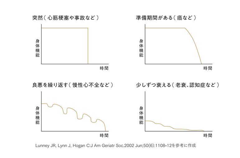 たとえば、自然な老いや認知症では身体の機能が少しずつ衰えていき、癌の場合は直前まで身体の機能が保たれる傾向があるそう。このように「誰もが“老いの途中”にいて」、「旅立ち方は人それぞれ」なのだという視点は、大切な人の突然の変化に戸惑わないためにも重要です。
